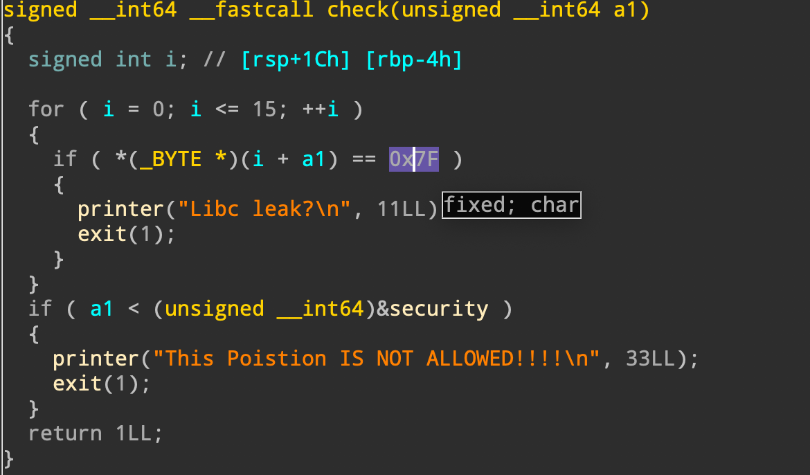 또한 0x10바이트만 0x7f를 검사하므로 출력할 주소 + 0x10 뒤에 libc 주소가 있어야 합니다.