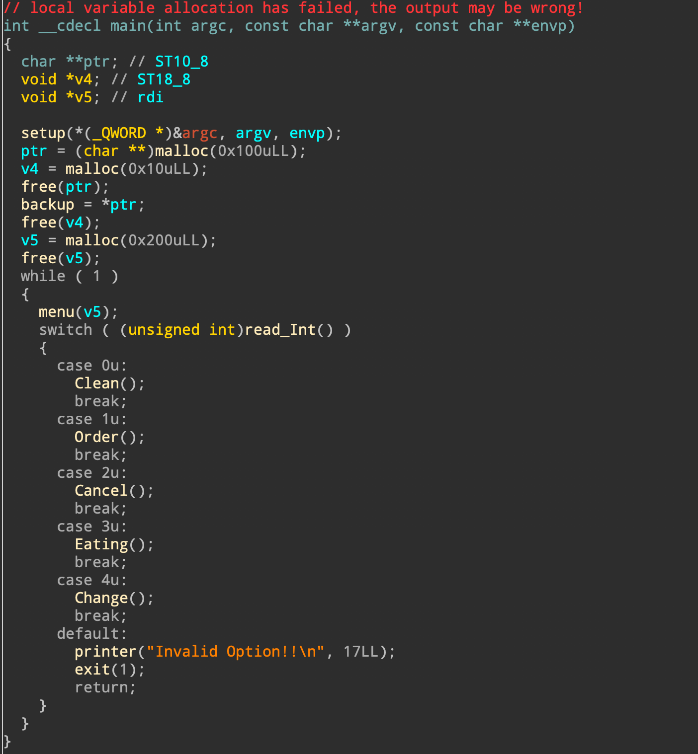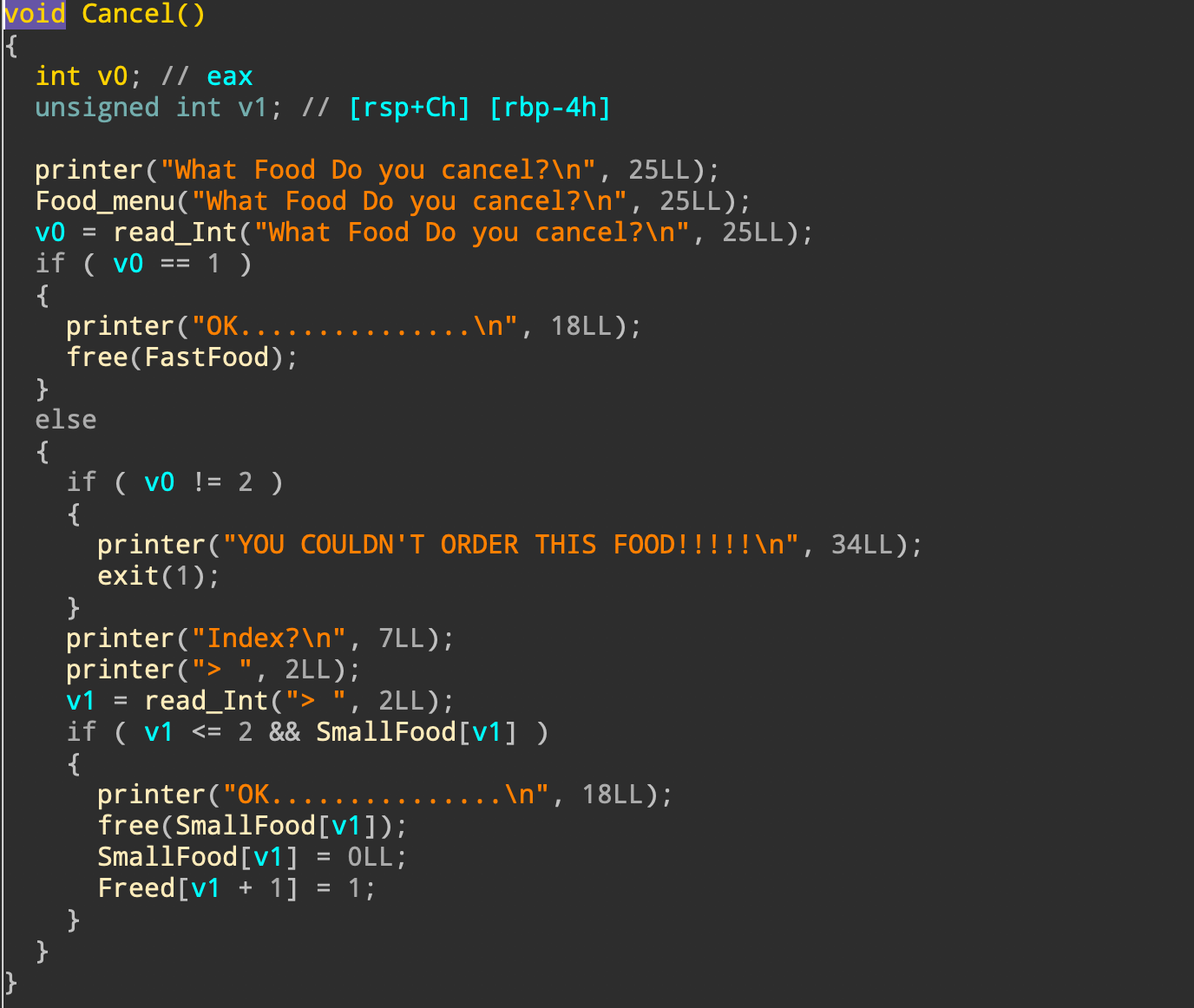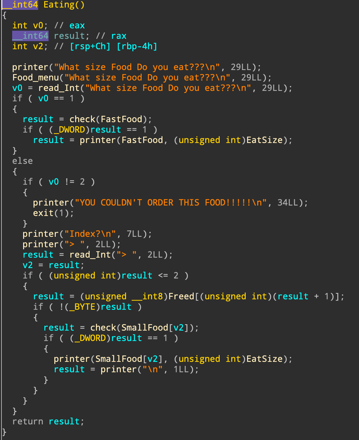 2. 0x38만큼 할당 & 입력 받음 -> 이 포인터는 FastFood 전역 변수에 저장
