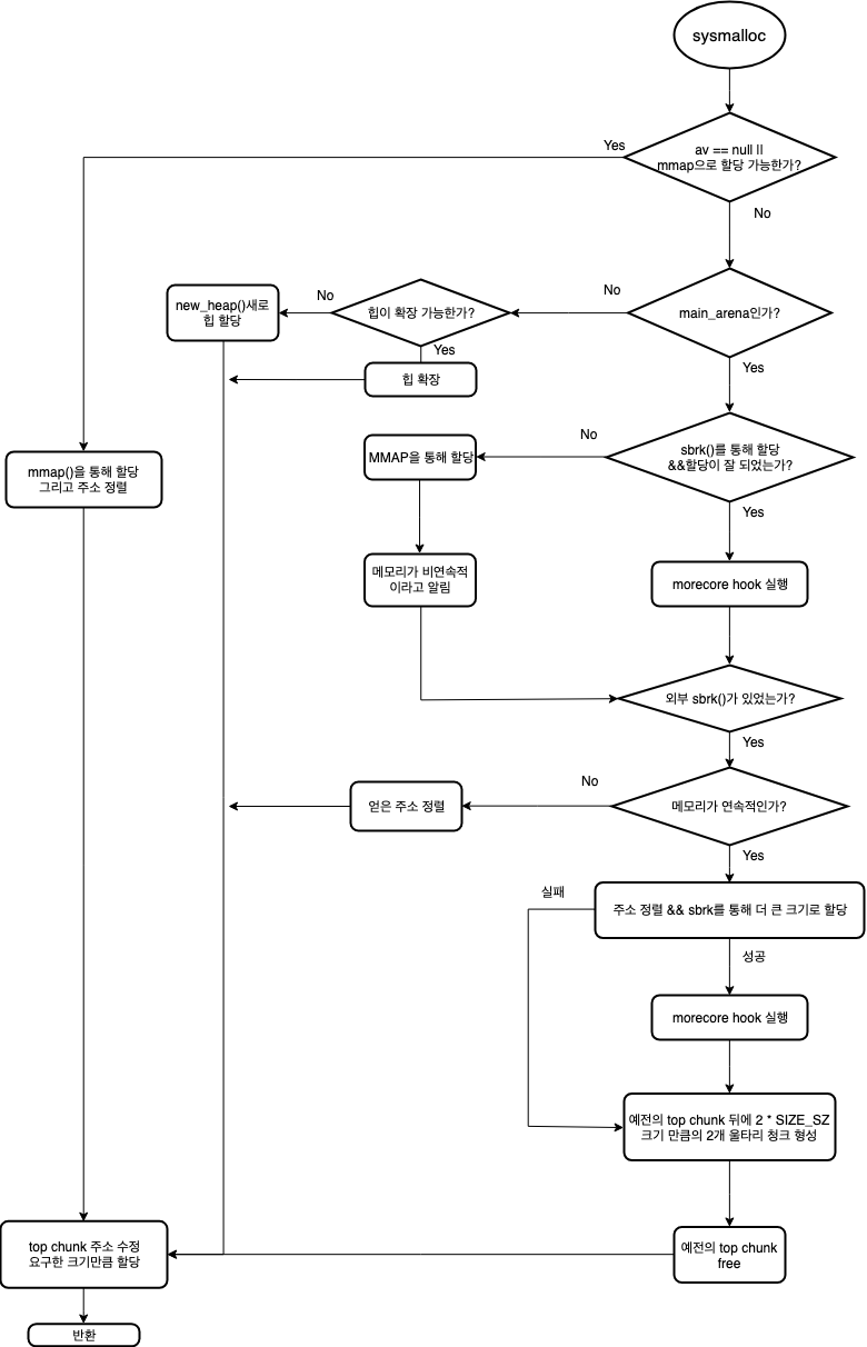 sysmalloc은 시스템으로부터 더 많은 메모리를 요구하는 경우(즉 top chunk의 크기가 부족할 때) 실행된다.