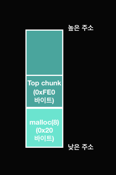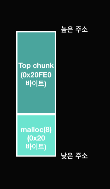 malloc(8)을 했을 때 정상적인 힙구조라면 이렇게 됩니다. 하지만 우리는 여기서 이 top chunk의 크기를 작게 조정할 것입니다. 조정을 하게 되면
