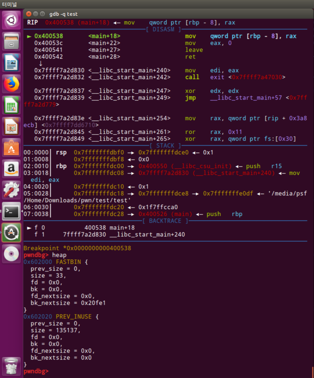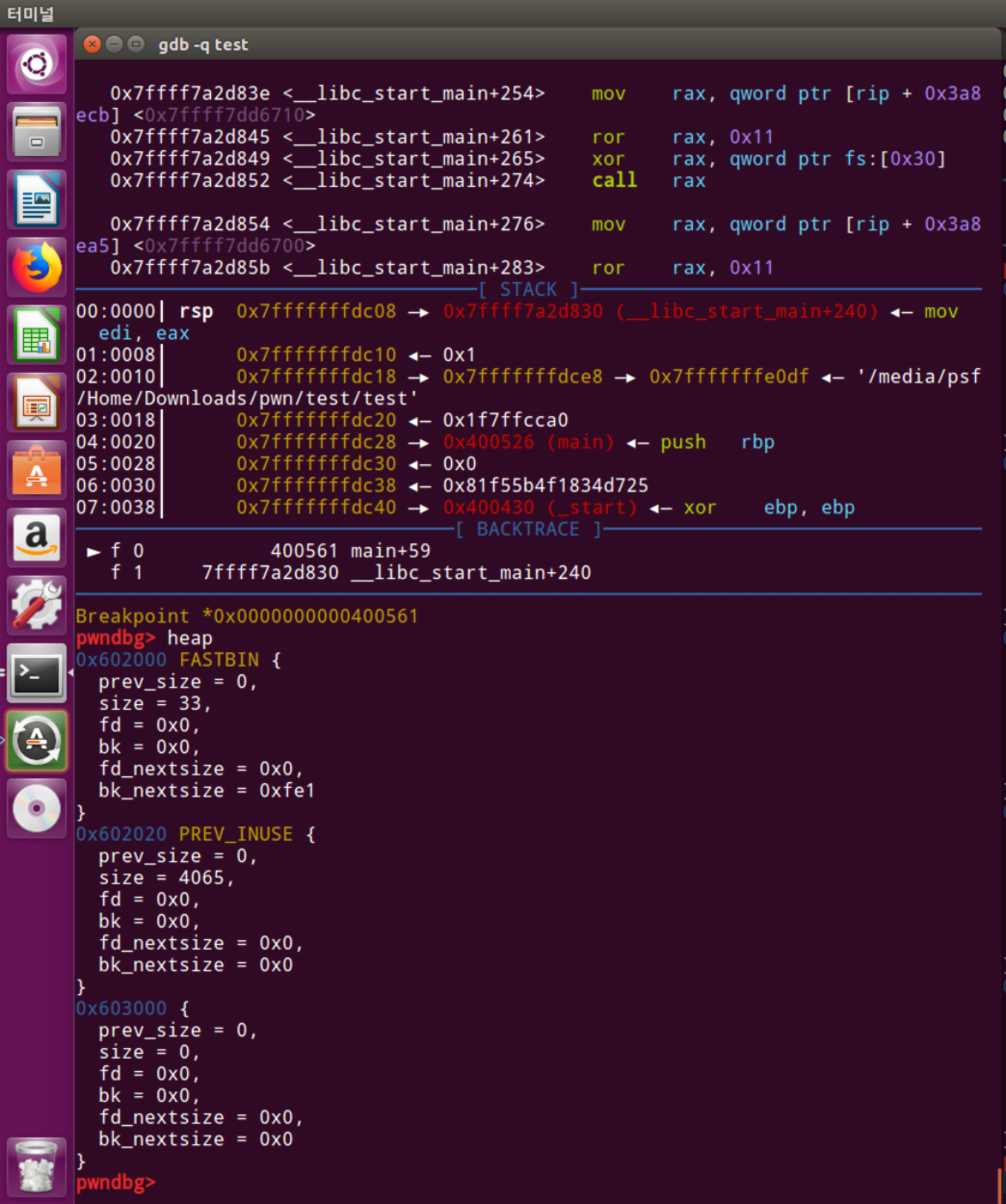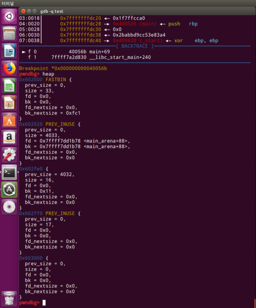 이 코드를 컴파일하고 gdb로 수정한 뒤의 코드까지 실행한 뒤 힙을 보게되면