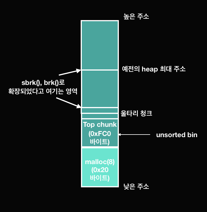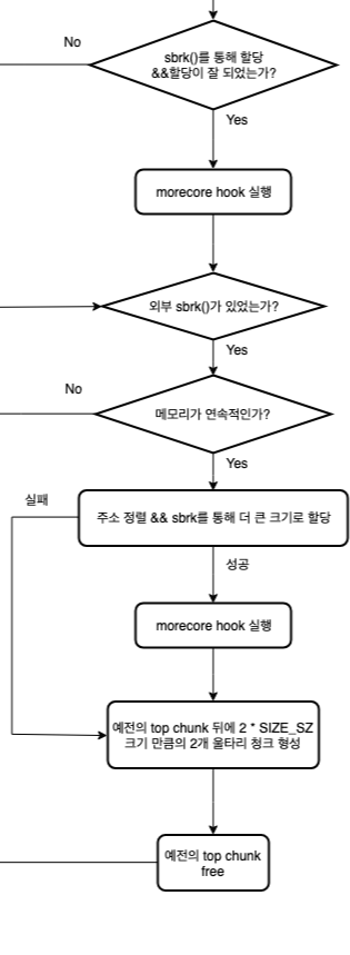 위의 순서도에 있는 과정은 malloc() 외부에서 sbrk()나 brk()가 호출되어 데이터 영역이 넓어졌을 때 입니다. 즉 우리의 첫번째 목표는 저 과정에 도달하는 것(malloc외부에서 데이터 영역이 넓어졌다고 속이는 것)입니다.