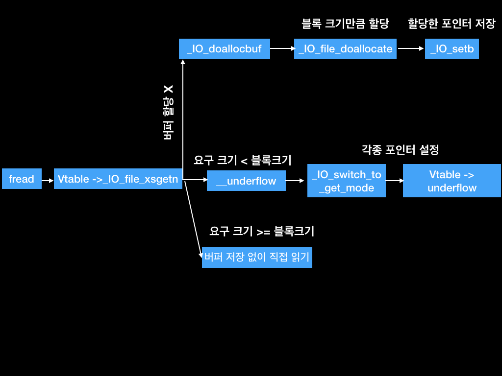 이렇게 _IO_new_file_underflow에서는 _IO_sysread를 통해 실제 파일을 읽고 fp의 read와 write에 관한 포인터들을 셋팅해줍니다.