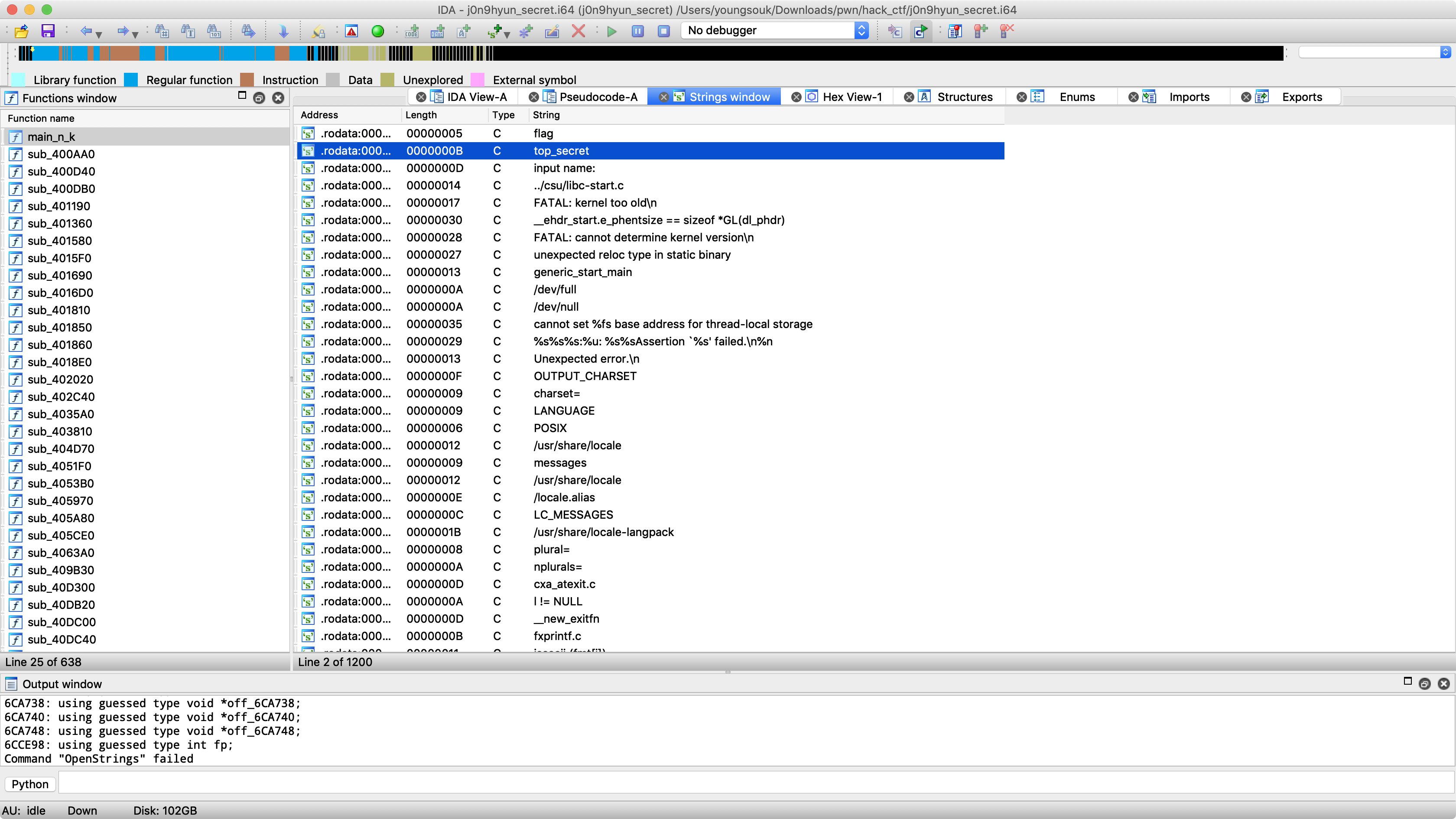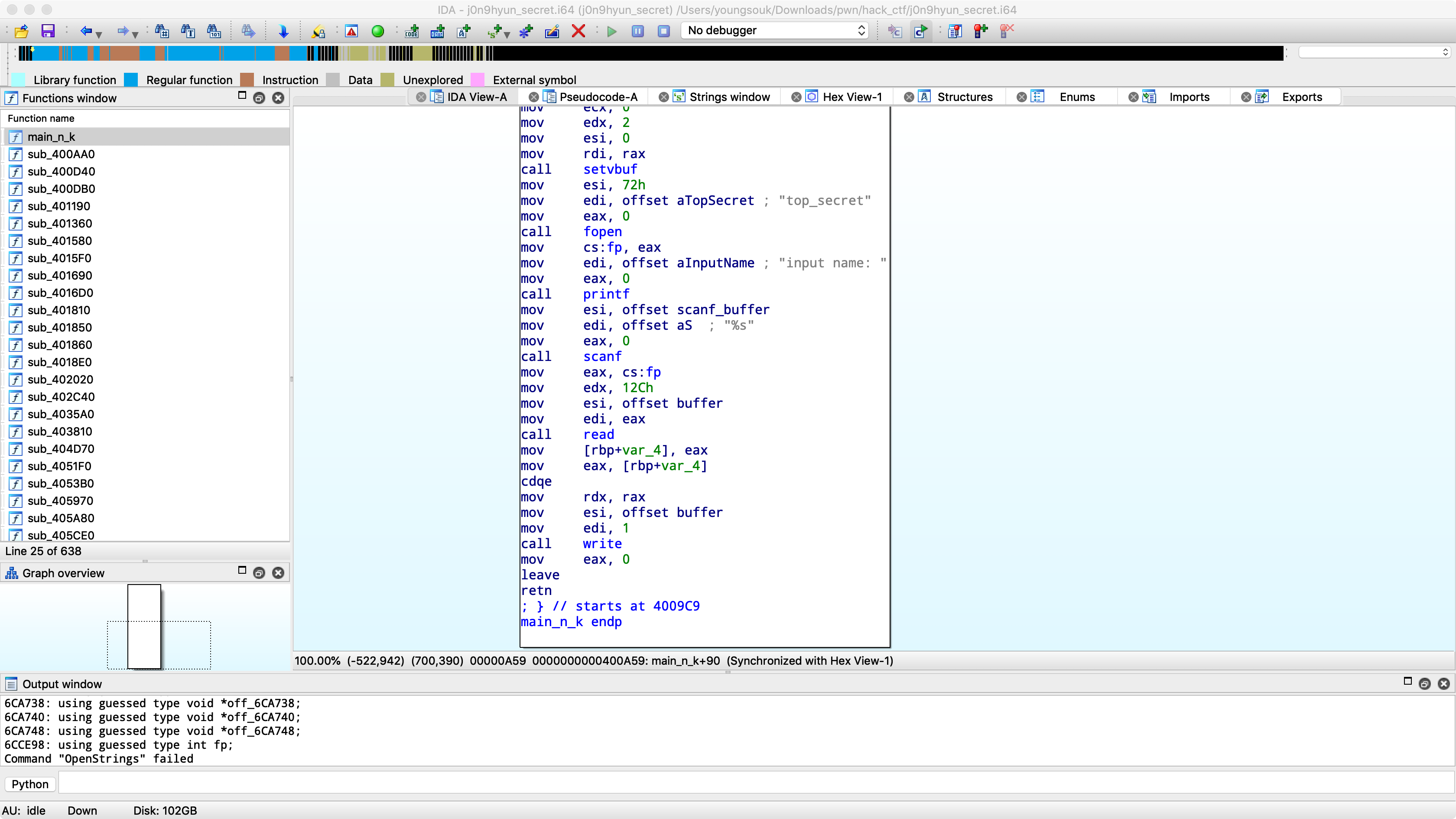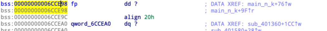 1. fp = fopen("top_secret", "r"); 파일을 열고 그 파일 디스크립터를 bss에 있는 변수에 저장해둔다.