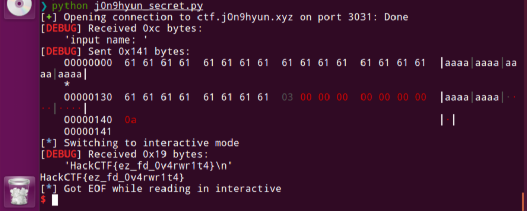 0x6cce98 - 0x6ccd60 = 0x138 즉 아무 문자 0x138개를 입력을 하면 fd를 침범해서 쓸 수 있고, 이것을 3으로만 바꾸어 주면 top_secret을 읽을 수 있다.